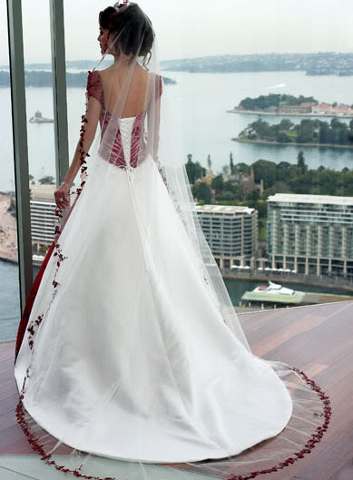 Vestido confeccionado en organza con aplicaciones en tono rojo.Escote cuadrado y falda princesa que termina en una pequeña cola redonda.Disponible de la talla 36 a la 46.